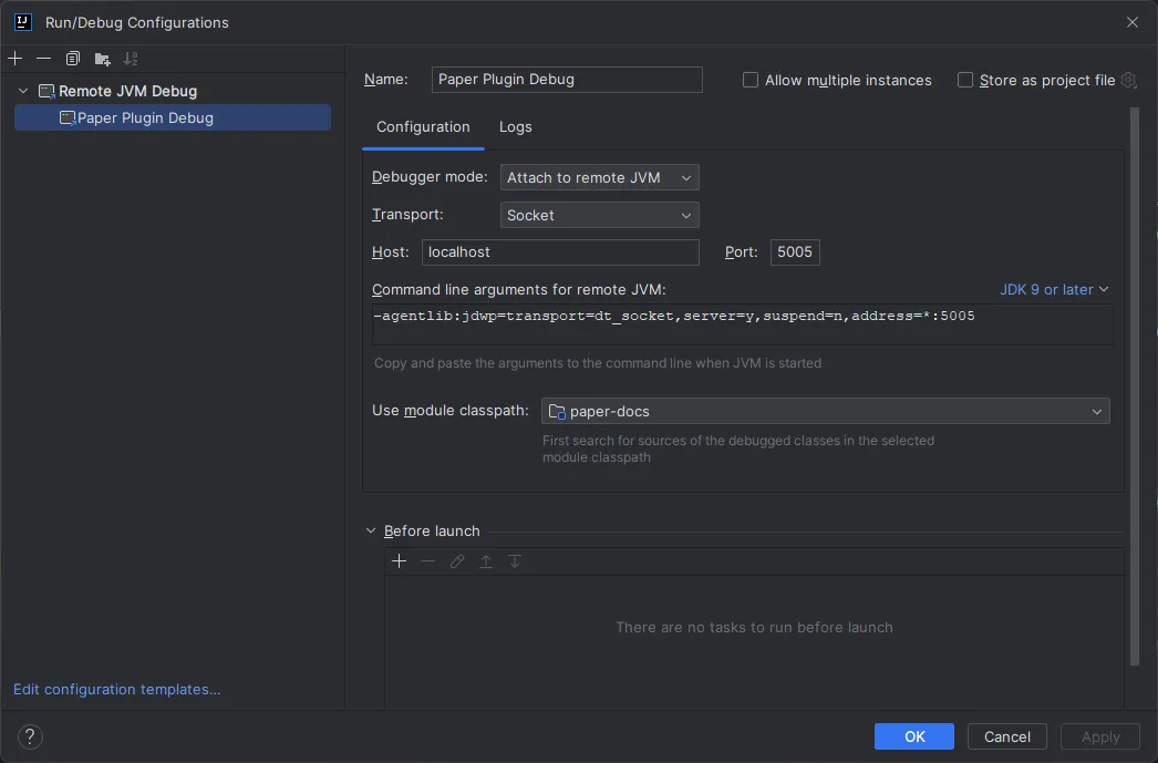 java -agentlib:jdwp=transport=dt_socket,server=y,suspend=n,address=*:5005 -jar paper-1.21.8.jar nogui
